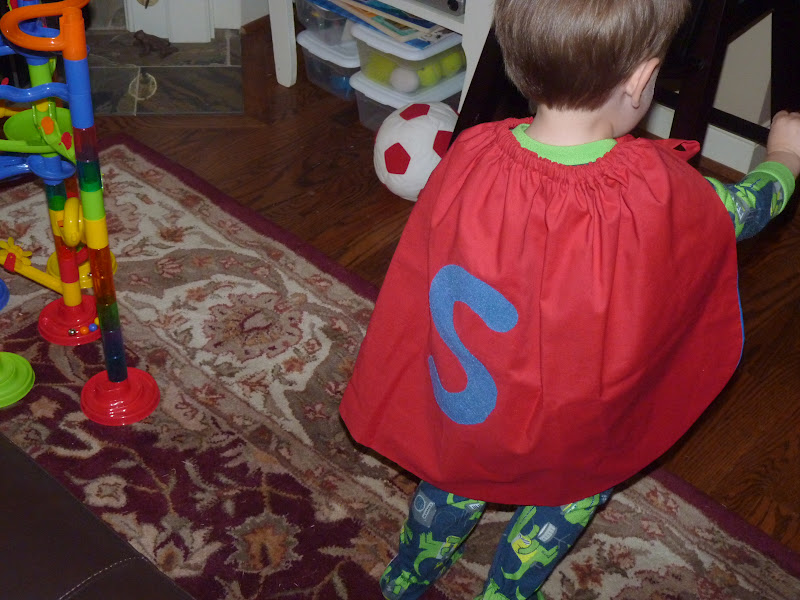 We just love Great Grandma's presents! They are homemade and straight from the heart! Not only did we get a quilt when we got married, but she always makes a unique quilt for each of her grandchildren when they are born with a special message sewn on the corner. We were delighted to get a cute owl one for Bennett. We know Bennett is going to use it often as he grows, but right now it sits on display on the bookcase in his nursery. However, to Trenton he was not overly excited with Bennett's quilt, but the other item in the box.....a cape! You see, when in Franklin, Trenton would wear Daddy's cape that Great Grandma made for him when he was a child. He love it and now he has a special one all for himself (you'll have to share with Bennett when he gets older, Trenton!) He zoomed around the house the night we opened the present and since then has worn in out and about in the neighborhood. He is either Buzz or Superman in it depending on the day. We will always think of you, Great Grandma, when we see the boys' quilts and this cape. Thanks!